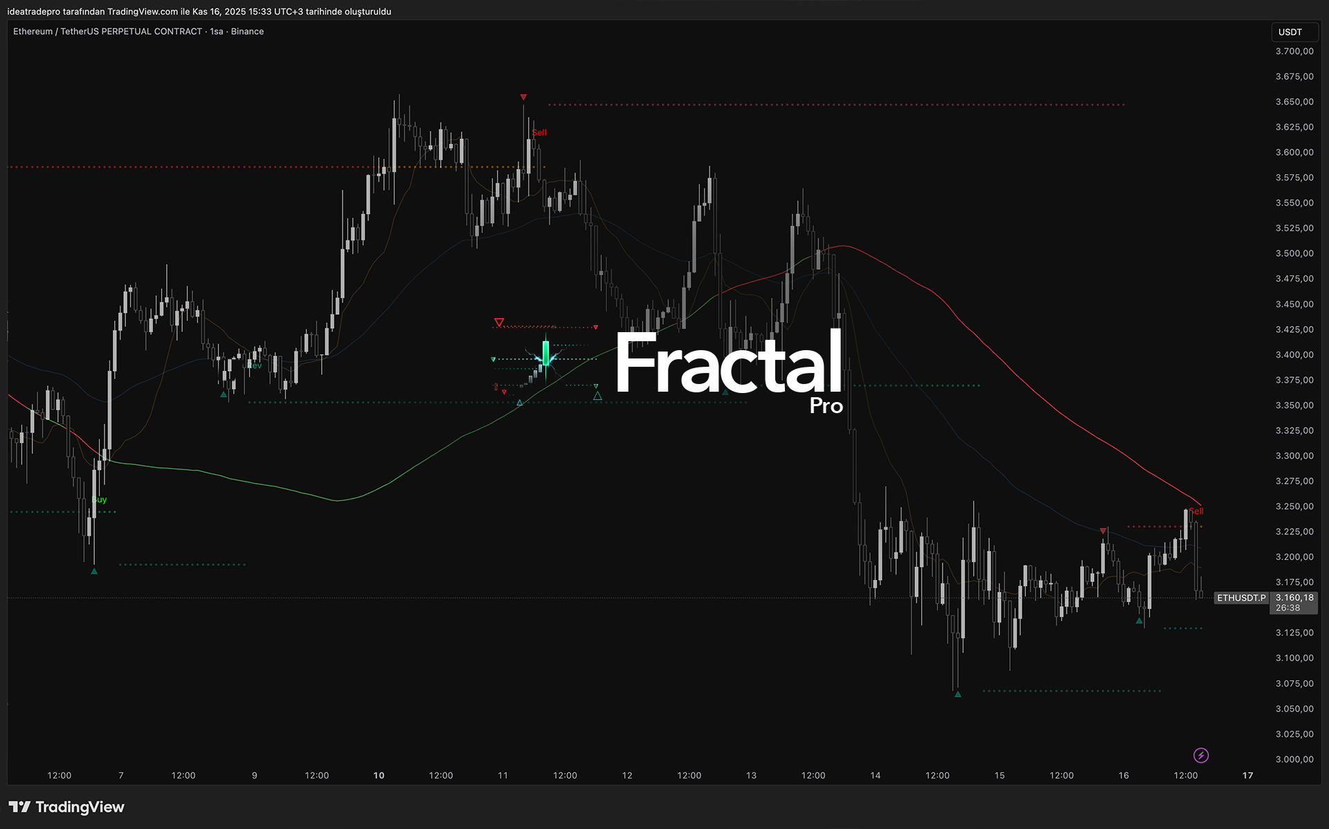 Fractal Pro, adaptif periyot ayarı ile volatiliteye göre otomatik optimize olan gelişmiş fraktal sistemdir. 6 farklı sinyal türü (Rev, T-Buy/Sell, B-Buy/Sell, MA T-Buy/Sell, Super Buy/Sell) ile kapsamlı analiz sunar. RTI (Relative Trend Index) ve OBV MACD entegrasyonu ile yüksek doğrulukta sinyal üretir.